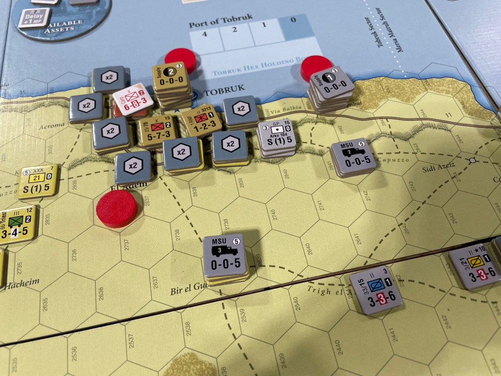 In any North African Theater wargame, supply will always be a major focus. The distances involved, including the difficulty with shipping across the Mediterranean Sea for both the Axis and Allies and Fortress Malta and the battle over this central point. The only way for the Axis player to get their units from Italy and across the Mediterranean Sea is through the port of Tripoli. They have to send all replacements, supplies and reinforcements that come on the board by the convoy routes from Italy to Tripoli. They can also send them to Benghazi but it is a bit more difficult. The Axis player will be able to supply a finite number of units on the board via these ports and will have to make the tough decisions to keep some units undersupplied if they are not needed at that very time. You cannot however allow the same units to be out of supply for consecutive turns as they will then begin to take Supply Attrition and lose steps so you have to do a macabre dance back and forth prioritizing how you use your limited supply. Also, in order for the ports to receive and keep units in supply, they have to be kept in good shape.