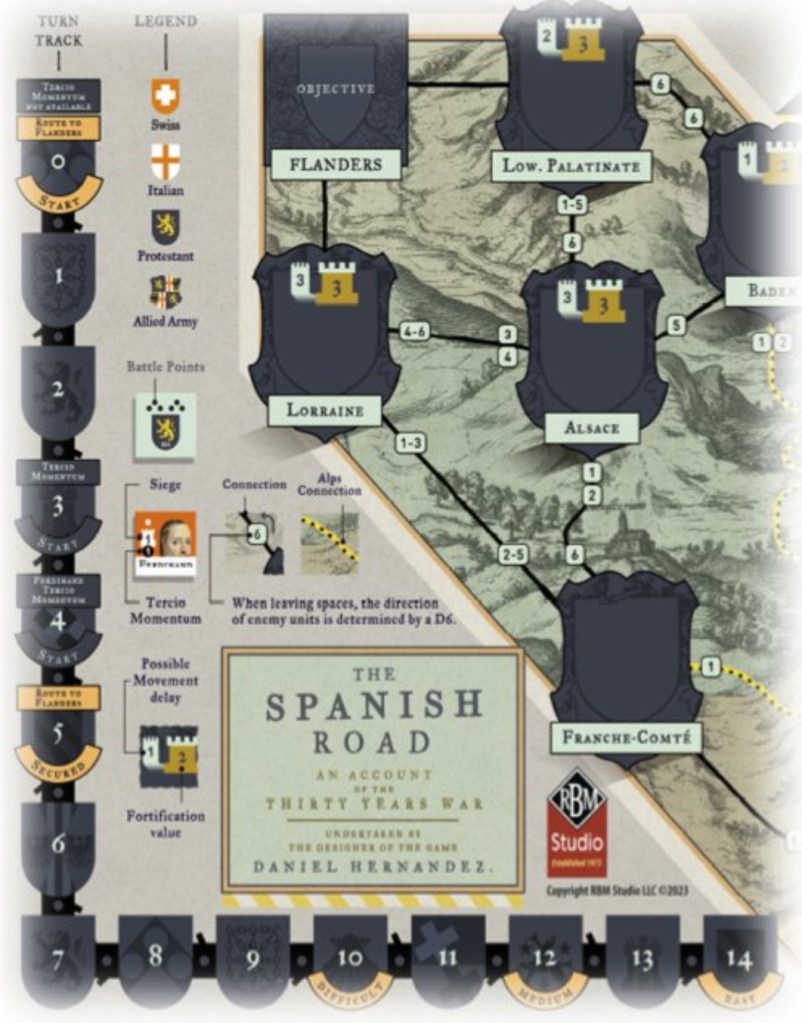 Daniel: The Spanish Road is a solitaire game where the player takes the role of the Spanish army marching from Lombardy (northern Italy), until reaching Flanders (what is actually Belgium, but at that time was known as ‘Flanders’ or ‘Spanish Netherlands’ depending on the historical sources), and the system (or AI) performs the enemy responses and challenges faced during their march.
