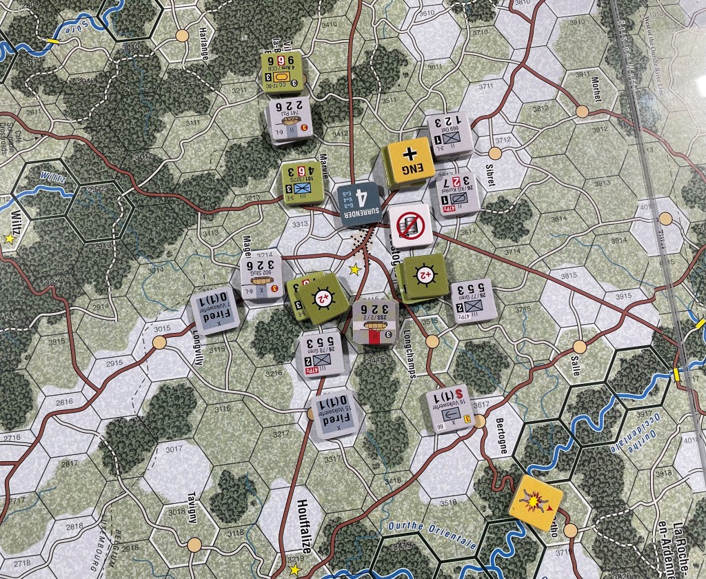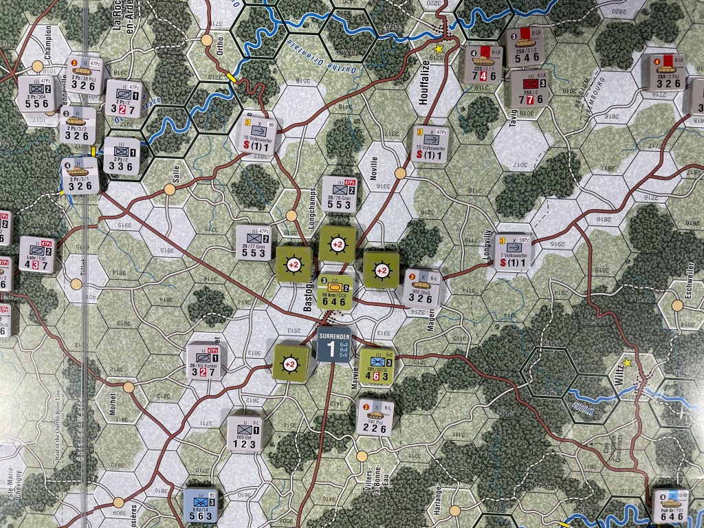 You might have noticed the large Surrender 1 marker located right in the middle of Bastogne. This represents an Isolated formation as they are unable to trace the 4 hex range to a road to gain Supply due to being surrounded by enemy ZOC’s and units preventing them from tracing to roads. This marker represents the level at which the Isolated Group of units will surrender. At the end of each round, the player surrounded will roll a D6 and consult the Surrender Table. The result is the number of Surrender Points that the Isolated Group will accumulate that round. Sometimes, if the roll is very low, they will actually gain resolve and reduce their Surrender Points due to having received an Air Drop). An Isolated Group will surrender when the Surrender Threshold for the unit types is reached through this process and those Surrendered Units will be immediately removed from play and cannot be replaced. The Surrender Thresholds are as follows: Green Unit Threshold: 3 Surrender Points, Normal Unit Threshold: 4 Surrender Points and Elite Unit Threshold: 5 Surrender Points. If the player can somehow make it until the weather clears in Turn 15 this roll will gain a –2 DRM for the Allied player only.