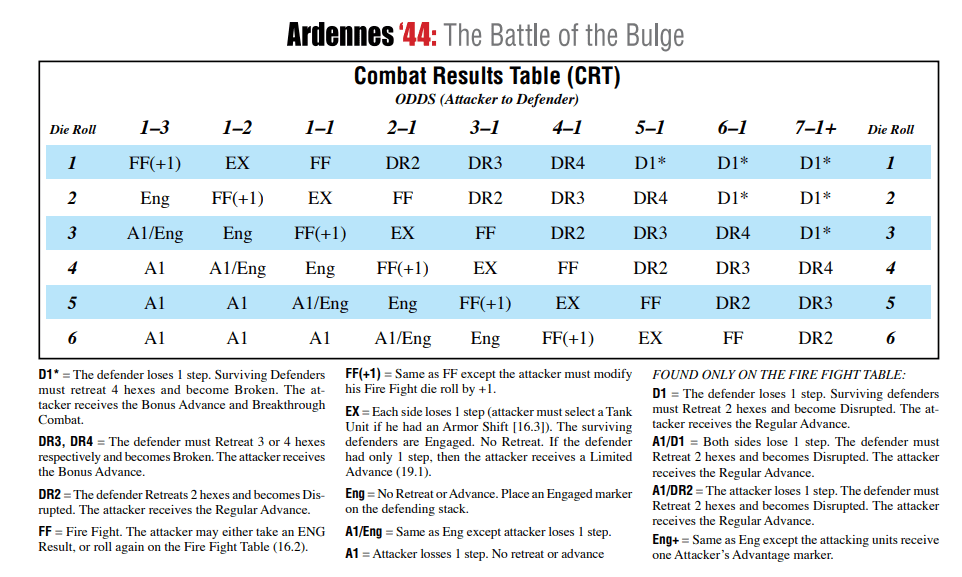 Combat was also great and that CRT is tough at low odds, particularly at 1-1. There are some very interesting results as well including Engage (the defending unit being unable to move away from the fight on their impulse), FF (Firefight), which is a version of Desperate Defense but for the offensive to be able to break through and keep moving. This would be used when you absolutely have to get through to either open up supply or force the enemy to retreat out of supply. There also is the very cool and unexpected Engage+, which is mostly the same as Engage except the attacking units will be given an Attacker’s Advantage marker. This marker stays on that stack of units until the next time they attack at which time they will gain a column shift.