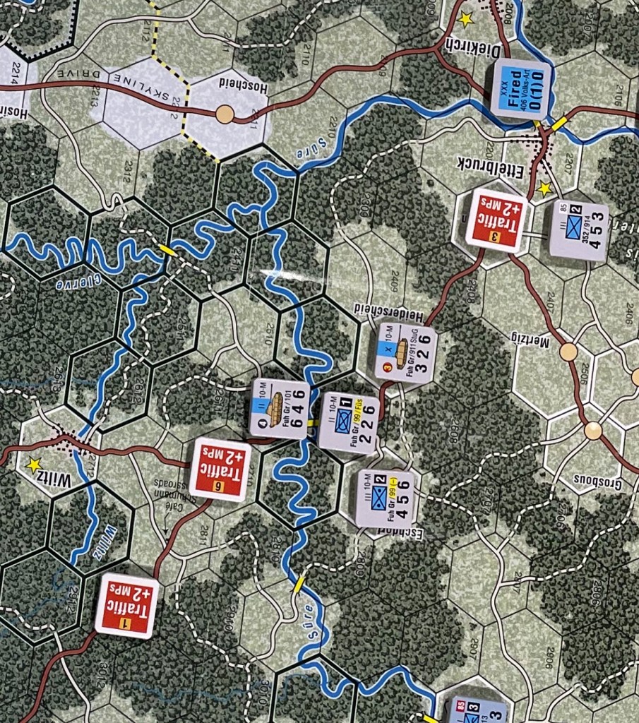 I also really liked the Traffic Markers that are provided to each player to simulate the difficulty with moving so many men and machines down 1 lane country roads through heavily wooded terrain. Each side has these markers and may place those that are available to them on roads in an attempt to slow down the movement of enemy units. But, in the rules it stated that these Traffic Markers are not just representative of the roads and their tightness but also roving German commando teams, SNAFUs, psychological disruption and air interdiction after the weather clears up in Turn 14. The Allied player has Traffic Markers while the German player has Greif Markers. These Traffic Markers act to increase the entry cost of the hex by +2 MP’s for all units. These markers do not however effect units that are performing Tactical Movement or that are retreating due to combat. Also the player’s own placed Traffic Markers have no effect on their units.