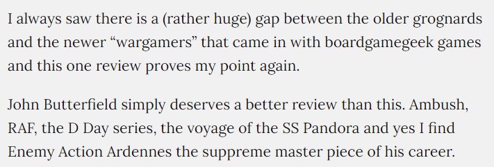 Man, after those posts went up, I got a few negative comments from various readers who felt many things about those comments. That I wasn’t a “real wargamer”, the gap between older grognards and the newer “wargamers” and my favorite that “John Butterfield simply deserves a better review…”
