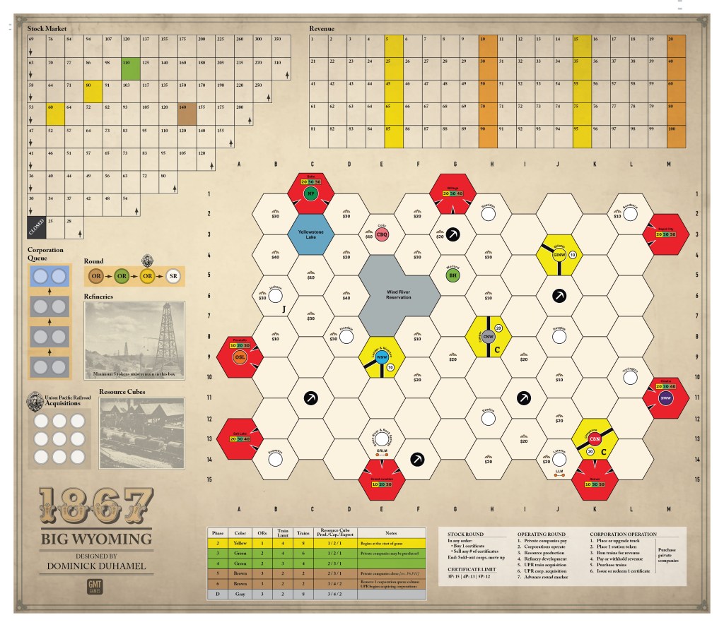 1867 Big Wyoming is a new game in the 18XX Series for 3 to 5 players that takes approximately 3 hours to play. In a game of 1867 Big Wyoming, players recreate Wyoming’s railroad history, assuming the roles of railroad operators, investors, and entrepreneurs seeking to strike it rich. Players will acquire private companies, establish railroad corporations, build rail networks that span the state, trade stocks, and develop Wyoming’s natural resource industries. The player who amasses the most wealth during the course of the game is the winner.