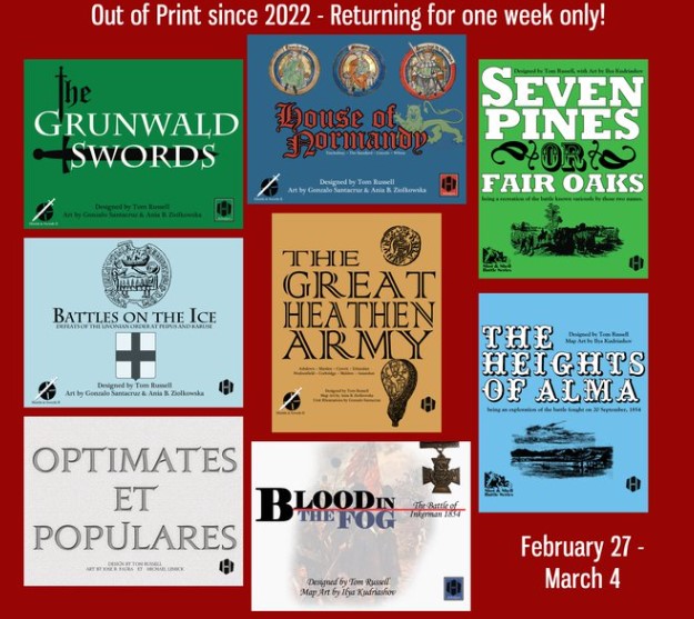 I also want to share this from Hollandspiele where they are offering several of their older games on reprint for the next week or so. There are some really good titles on this list so snatch them up while you still can. I bought a copy for Optimates et Populares recently from this offer and am really glad to have got my hands on it.