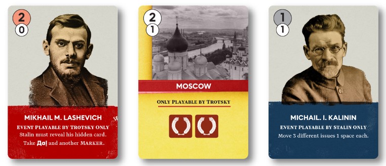 Lenin’s Legacy is a fast-paced solo or two-player game about the power struggle between Stalin and Trotsky in the early days of the USSR, starting the moment Lenin’s health began to weaken after a failed assassination attempt in 1918 and culminating with Lenin’s death in 1924. Players will take on the role of either Stalin or Trotsky, playing cards from a common display (plus one hidden card each) to gain control of “issues,” such as the NKVD, Politburo, and personal access to Lenin. Cards can also be played for specific historical events, and additional Region and Politician cards may enter play each round, favoring whichever player was able to control the relevant issue in the previous round. Victory can be achieved in three different ways: control of the Army, domination of the Party, or lasting Fame after Lenin’s death. Players must therefore balance short-term gains towards each of these conditions with long-term bonuses from Regions and Politicians, while also ensuring that their opponent is not able to play the cards that will most benefit them. The result is a tense, fast-paced game where every card counts and you always have to stay one step ahead of your opponent.