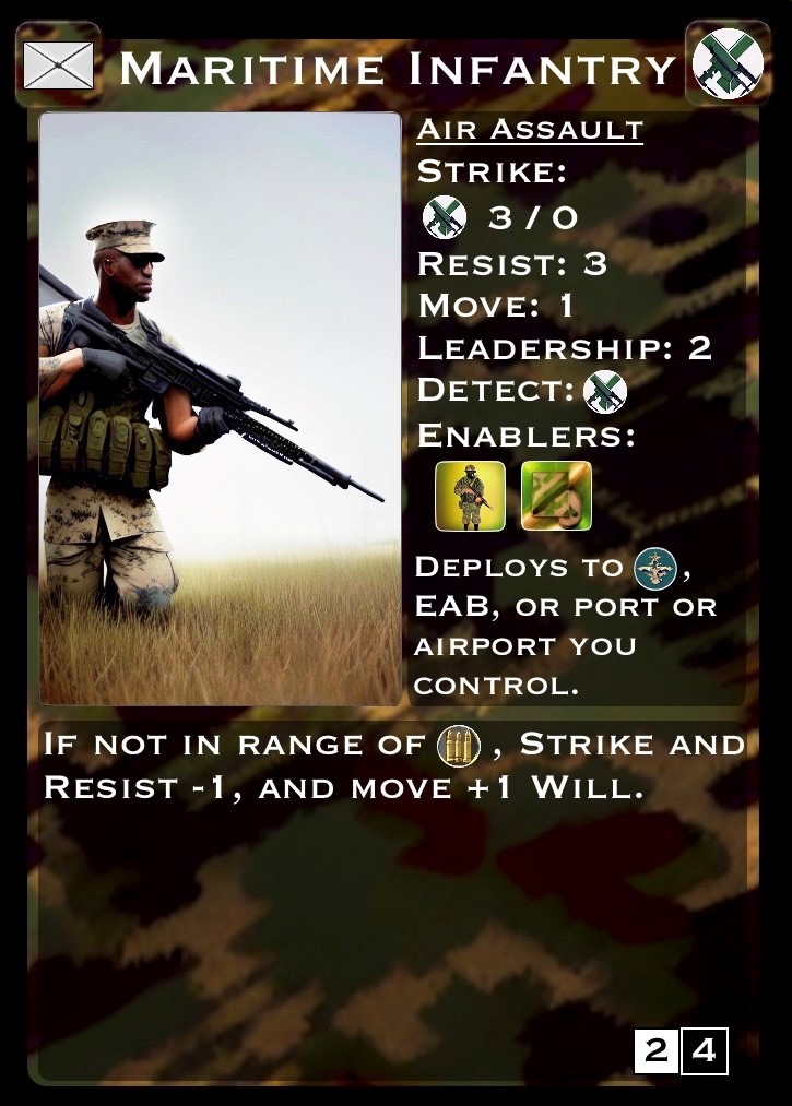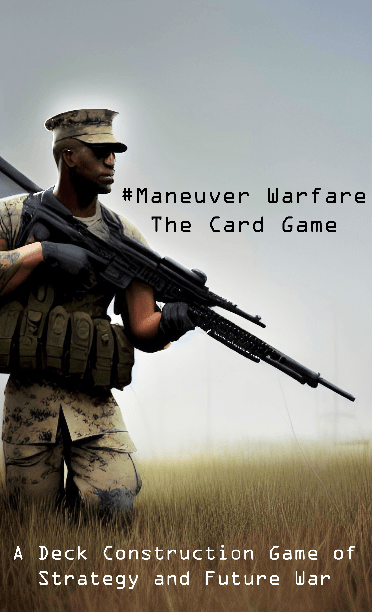 #Maneuver Warfare: The Card Game puts modern warfare in your (cargo) pocket. This deck construction-style wargame explores the complexities of war today and tomorrow.  Players build decks from a card arsenal ranging from guerrillas to unmanned underwater vehicles to next-gen fighter aircraft capable of dominating the various areas (‘domains’ in the game) where confrontation will take place.  You can choose a deck heavy on high-tech satellites, hackers, and online influencers or you can focus your efforts on direct action with airmobile forces, armor, and massed artillery.