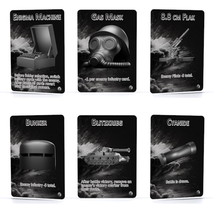 Players strategically assemble their military decks by selecting from a collection of Infantry, Pilot and Sailor poker size cards. Each of these form part of the tactical effort to forge the path to victory. Military cards are a key component of the game as they are used to either 1) win battles, 2) assist team members or 3) trade to obtain tactical cards.