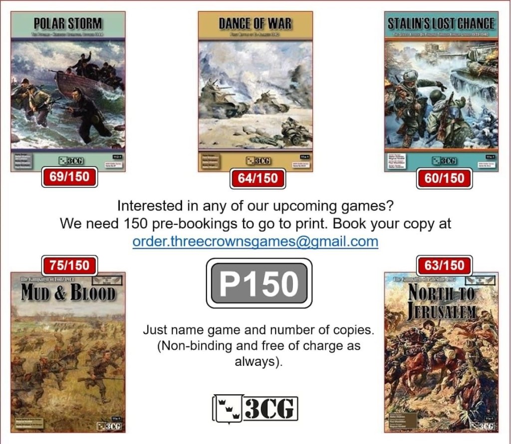 If you are interested in The Campaign of Palestine 1917: North to Jerusalem, you can pre-order a copy by sending an email to order.threecrownsgames@gmail.com listing the titles you are interested in. Notice that no prices are listed but their other games have been sold at or near 40,00 € (around $43.00 US Dollars).