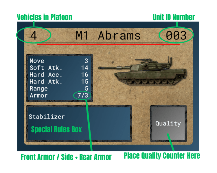 The D20 is important in my design because it offers both granularity and simplicity. I felt like a D6 didn’t offer enough “steps” – going from rolling 3 to hit to rolling 4 to hit felt like too big of a jump in probability. In nearly all cases, there’s a set value and rolling under that value is a success. This allows, for example, the M1 Abrams to have an accuracy value of 15, so any roll of 15 or under (after modifiers) is a hit.