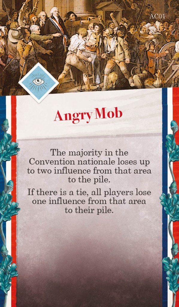 Angry mob: This is a card that needs to be played immediately when drawn. If you have a majority in the Convention nationale area you will be the starting player each round and you will be able to propose laws BUT if things turn sour, YOU will get the blame.