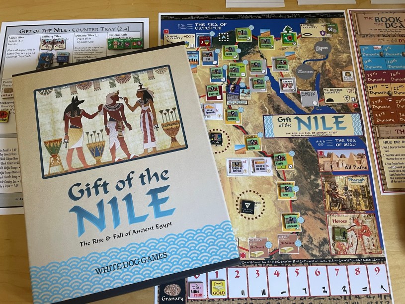 I have really enjoyed my plays of several solitaire games designed by R. Ben Madison. He has a knack for including elements of the history into the gameplay while placing the events into the framework of his chosen system, which is usually the States of Siege Series…but not necessarily always. His newest offering is called Gift of the Nile: The Rise & Fall of Ancient Egypt from White Dog Games and is a solitaire only game that uses the States of Siege Series System and delves into Ancient Egypt and the rule of the Pharaohs covering over 30 dynasties starting with the Old Kingdom in 2,600 BC to the Late Period starting in 700 BC and ending with the intervention of Rome. This is a long and involved game (ranging from 36 turns to something less based on certain conditions happening or a player loss) that really gives the player a good feel for the might and power of the Egyptians, as well as the various threats and enemies they had to deal with to survive for nearly 3,000 years.