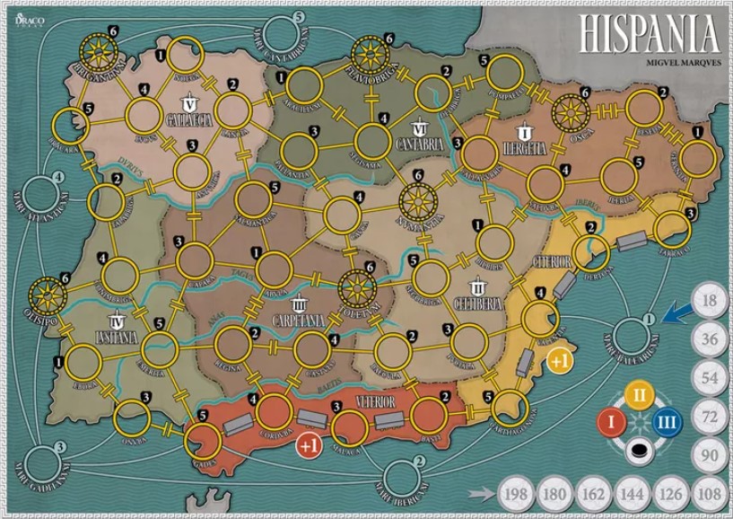 Miguel: As in Tetrarchia, the engine of two d6 requires 6×6=36 spaces. In Tetrarchia I had 6 regions with 6 provinces each, in HISPANIA (“region I” of Tetrarchia by the way!) I zoomed out to have 6 provinces with 6 cities each. As I said, these “provinces” are somehow artificial, but I selected their names from the most significant Hispanic peoples (there were many more) that inhabited those areas. Once I had the provinces, the board spaces where the cities, and I went through a selection process in which many compromises were made. The game takes place over two centuries, and some locations that started as Iberian villages became Roman cities later.