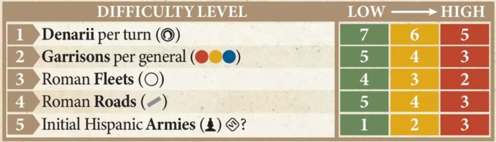 It is not just about quantity. In HISPANIA, those parameters are the numbers of: coins/points per turn, garrisons per general, fleets, roads, and initial Hispanic armies. The medium level has respectively 6-4-3-4-2, and then you can shift +-1 any of them. This allows to make the game easier or harder on the specific aspects of your choice. And independently of the player experience, any player will find the easiest level (7-5-4-5-1) very easy and the hardest level (5-3-2-3-3) a real nightmare! Therefore, any player will be able to find their own sweet spot within the table.