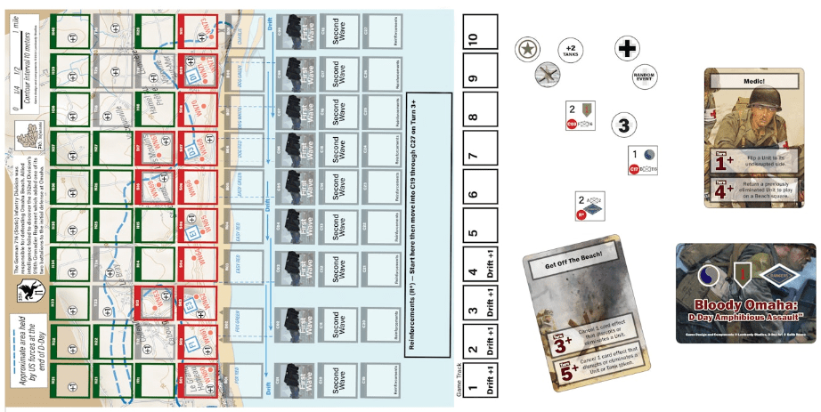 Dana: Bloody Omaha: D-Day Amphibious Assault is a solitaire and 2-player board game that comprises multiple landing waves and drift, beach obstacles, fortified defensive positions and strongpoints, hedgerow terrain inland, large 1-inch counters representing American infantry companies (battalions in later reinforcement waves), U.S. engineers and tanks, hidden defense die-cut marker Tokens including German armored vehicles, plus playing-card-enhanced tactical opportunities and challenges. The final version will include the playtested rules and movement/engineer/combat and Random Event tables, plus a 6-sided die. (Everyone who fills out and sends in theirplaytester feedback form gets their name printed in the game credits.) An Add-on deluxe expansion has thicker die-cut counters, a larger 18-by-18-inch mounted game board map, a storage box for everything, and new illustrated battle notes with a commentary by me.