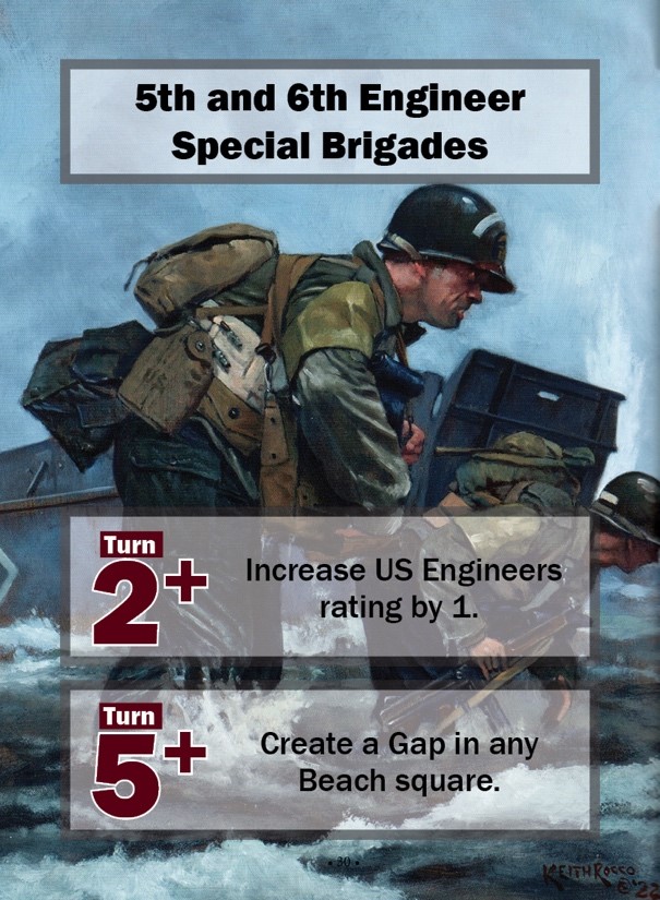 Dana: My developer, Craig Robertson, suggested a really good idea. Instead of a traditional opposing sides version (US versus German), both players are American: one activates, moves, and attacks with the 1st Infantry Division (BRO) while the other player has the 29th Infantry Division and Rangers. They compete to see who captures the most territory off the beaches.