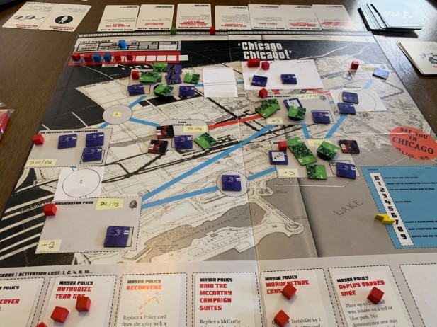 It was at this point that Chicago ‘68 came into being. Fortunately my brother, Ronen Goldstein, has been toying with his own designs and taught me how to develop games on TTS and the Game Crafter. From there, I found my glee in the intellectual challenges of research and ideation, and of course, the tactical thinking that this emergent, anything-goes match up produced (it’s especially fun when accented by sibling rivalry). In short, I found myself designing the game I actually wanted to play.