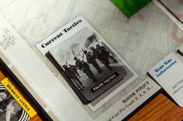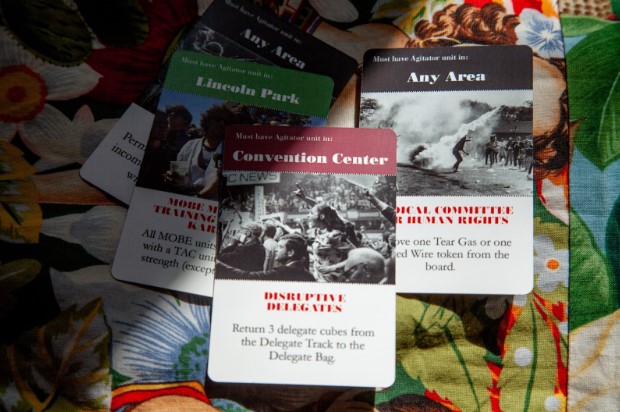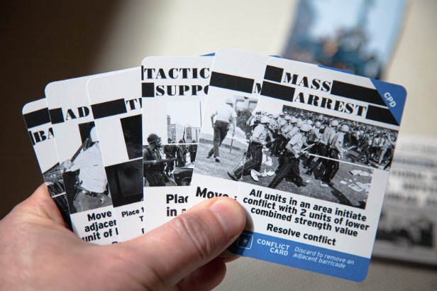 Yoni: My aim with Chicago ‘68 is to create a game that opens up a space where we can link ourselves to the past. In this way, it’s more akin to a folk song than a strict historical simulation. While all the events depicted in the game happened in the past, the players are challenged to inhabit their roles as if history does not point to an inevitable outcome. After all, a “riot” comprises a million points of conflict, but when a player resolves a conflict card it signifies an action that is “historical” – i.e. an event that gloms onto our collective memory and becomes something worth remembering through music, board games, or movies.