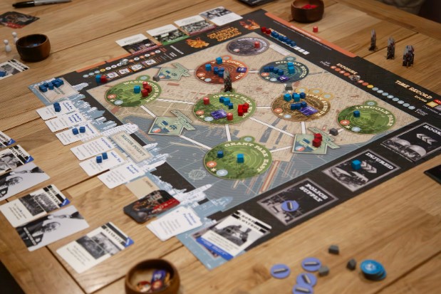 Yoni: If I had to narrow it down, the one thing that most pleases me about the design is how it continues to yield totally new and unexpected game states. Even now, after hundreds of plays, a unique strategy will emerge through the combinatorial possibilities between the various event decks / card effects. In fact, you will only see about 50-75% of all three randomized decks (the Mayor’s Policy Deck, the Street Theater Deck, and the Mob Chaos Deck) in any game. Order of operations matters in the way these cards interplay as well. One card effect may trigger multiple cards in your splay. So even though you will start with the same asymmetric menus of actions for each side, you will never play the same game twice.