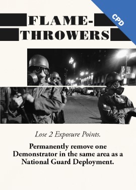 The “Flamethrowers” Card is a special Action Card that the Mayor can add to the Police Deck through the policy splay. During the convention, National Guardsmen were equipped with converted military grade flamethrowers (“CA-3 back-pack sprayers”) to dispense tear gas at close range. One witness recalls the use of these weapons near the downtown bridges over the Chicago River: “As the crowd swelled, it surged periodically towards the Guard line, sometimes yelling, ‘Freedom, freedom.’ A Guardsman stepped in front [of the Guard line] and walked the width of the bridge laying down a stream of tear gas. The wind was then from the northeast and the gas was generally blown back into the Guard lines and southwest toward the Hilton…”