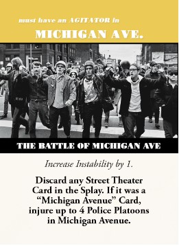 Lastly, this is a powerful Street Theater Card that demands careful timing to trigger effectively. It depicts the so-called “Battle of Michigan Avenue” on August 28th. In the game, I allow the possibility that some demonstrators were capable of fighting back. However, what typically occurs next is that the Police player takes advantage of Agitator presence to mass arrest or tear gas in Michigan Avenue.