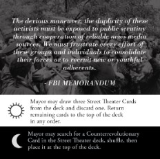 The card effect is also unusual because it allows the Establishment to interact with the Street Theater Deck. The night event is especially disruptive to the Demonstrators as it will plant a Counterrevolutionary in the next Agitate action.