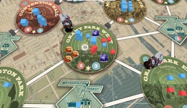 Yoni: Each space on the board where a unit can be placed is a “City Area.” This includes historically significant sites like the Convention Hall, the Hilton Hotel (where many of the delegates and politicians were accommodated), and Michigan Avenue (the main commercial artery in downtown Chicago). Other City Areas include the parks, where the demonstrators initially gathered, and “transit areas” which add interstitial spaces representing geographical distances between locations. Each City Area has an Exposure Value representing the shifting dynamics of news media coverage – i.e. Demonstrators who stir things up on the Convention floor will gain more Exposure in their favor than the police officers who have to arrest them. Inversely, the Police are incentivized to enforce law and order in the Parks, where they are more likely to gain favorable Exposure. The main City Areas (i.e. not the transit areas or Cook County Jail) will also provide capital to the Mayor, assuming that the police are successful at clearing out any Demonstrators before the round ends.