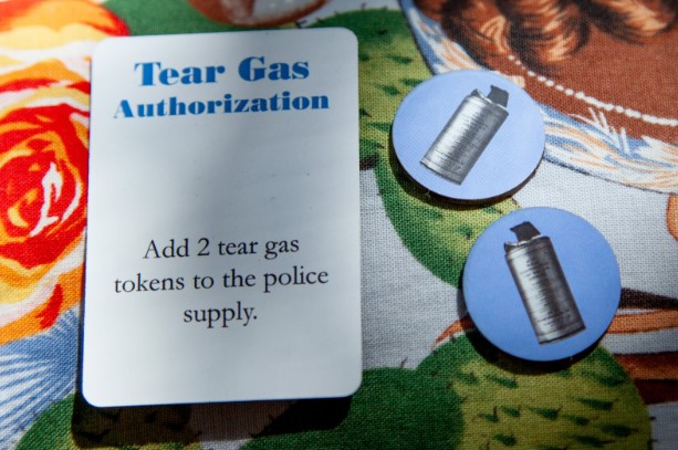 Yoni: “Tactics” is a small deck of 6 unique abilities that the Police may activate once during their turn. If timed right, these cards can enhance the overall Police strategy against the Yippie’s Street Theater effects. Only one Tactics Card may be in effect at a time, but the Mayor may spend an action to shift Tactics during the leadership phase. Some of the Tactics include the ability to dismantle the Demonstrators’ rally flags (their recruitment points), to raid the opposition candidate’s suites and thereby remove a pledged delegate, or to utilize Mob payoffs to benefit from raising instability.