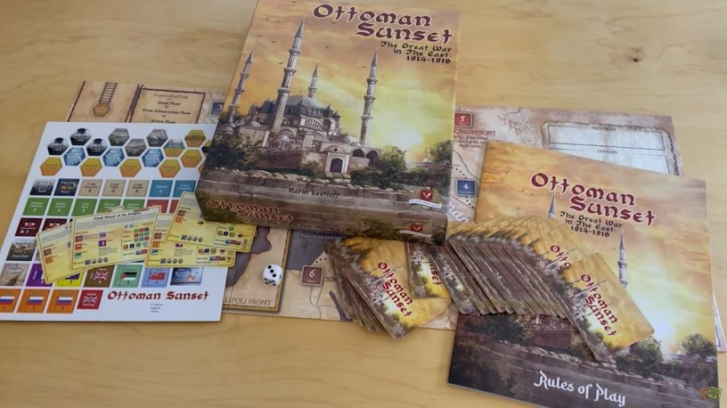 Ottoman Sunset 3rd Edition, by designer Darin Leviloff, is a stand-alone solitaire States of Siege Series game on World War I in the Near East from 1914-1918. The player controls the Young Turks (CUP or Committee of Union and Progress) as they try to keep the Ottoman Empire alive amidst the struggles of the Great War.