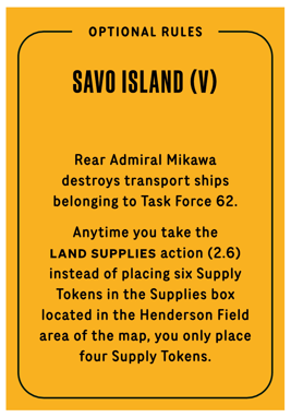 The text reads: Rear Admiral Mikawa destroys transport ships belonging to Task Force 62. Anytime you take the Land Supplies action (2.6) instead of placing six Supply Tokens in the Supplies box on Henderson Field, you only place four Supply Tokens.