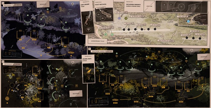 Vince: The gorgeous game board was designed by Nils Johansson. Right from the first conversation he had a strong vision of how it would look, and that he would contrast the night assaults conducted by the infantry with the day time air raids against Henderson Field. The board depicts the major areas of fighting: The Matanikau River Mouth, the Matanikau River Log Bridge and the Southern Lunga Perimeter, where fighting was the heaviest. Also depicted is Henderson Field, which is affected by the Operational choices made by the player. There are also trackers for Coast Watchers on Bougainville Island, the approach of the light cruiser Yura and the success or not of Search and Patrol flights conducted to locate Nagumo’s carrier force. Finally, there is a section for Colonel Oka’s attack that took place in the early hours of October 26th. This was a bit of a non-event but I wanted to include it for the sake of completeness if nothing else, so it is highly abstracted but does affect the final Victory Point total.