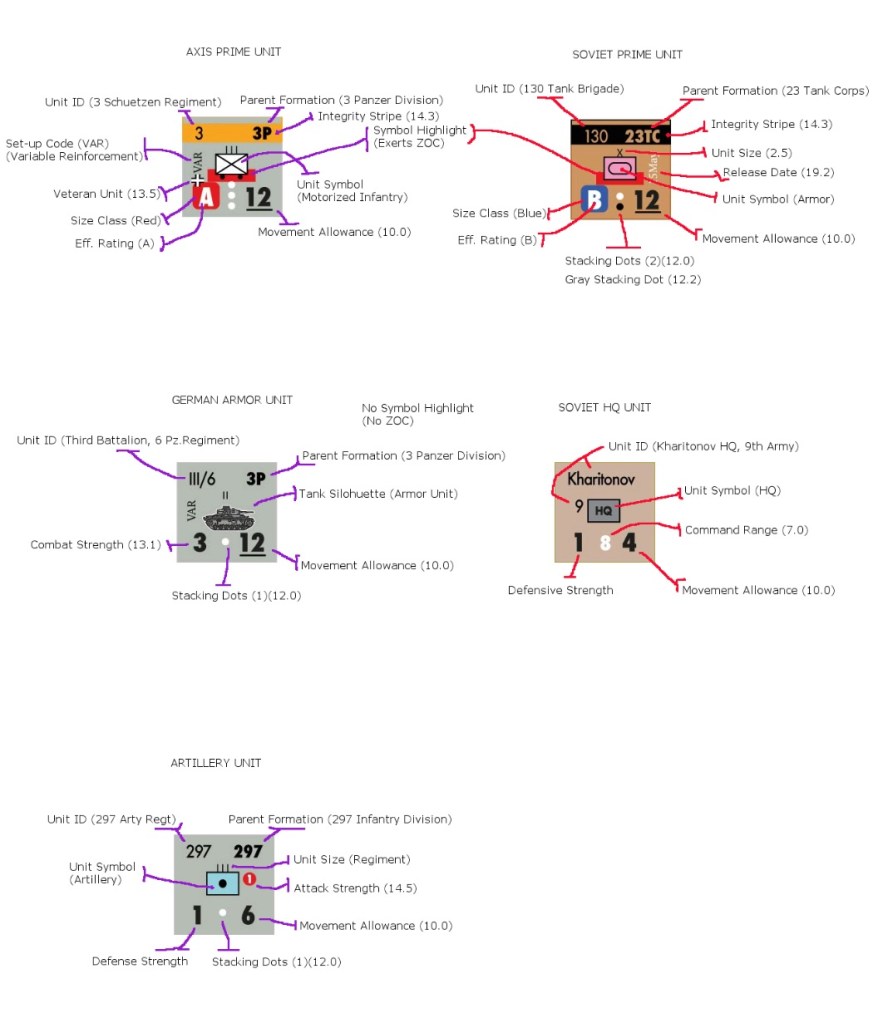 Greg: Most large units have a rating versus a set strength. The combat strengths are on chits that are randomly drawn from a pool. The rating tells you which strength to use from the strength chit. In this way you cannot know exactly what strength the units will be until you are resolving combat. Chits usually stay with the unit and are flipped when losing a step. If a unit loses a second step the chit is returned to the pool and the original unit is flipped to a cadre side which has a strength of one.