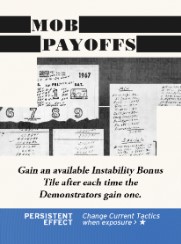 In the game, this is a critical card to play for the Establishment player if and when you’re about to lose control over Instability (or, conversely, if you are about to unleash a coordinated multi-area teargas attack). Beware though, there are a number of ways that Mob Payoffs can backfire!