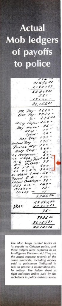 In 1968, the Chicago Police Department was notoriously “on the take” – i.e. on the crime syndicates’ payroll. A Life Magazine exposé, published on Dec 6 1968, printed actual ledgers from Mob accountants with officers’ names and cash “bonuses” paid (this is the image featured on the card). In the article a police officer explains the scope of the matter as; “There is no way you can be on this police force and not take payoffs. I’m offered money every day. Now I get a payoff from my sergeant.” A Justice Department report from 1963 is also quoted, pointing at officers and local politicians who took orders from Chicago gangsters Momo Salvatore Giancana and Gus Alex. “Significantly,” reports Life Magazine, “some of the worst instances of police rioting in August occurred where the districts are most corrupt…And this corruption, in turn, has a lot to do with the inability of certain Chicago police commanders to control their men.”