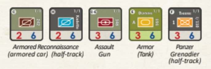 The Germans have mostly regular infantry companies—not as good as the paratroopers but better than the FFI. All German regular infantry units arrive at full strength of 3-steps. There are a few elite German units that are comparable to Allied paratroopers, such as fusiliers. The Germans have a few weaker pioneer (engineer) and alarm companies that have only 2-steps of strength. The best German units are the Panzers. These range from halftrack and armored car platoons, with only 1-step, to an assault gun company with 3-steps. Like the American Sherman unit, the German Panzer units have superior firepower, survivability and mobility.