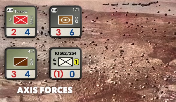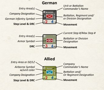 Dan: As the new solitaire version was being developed, it became clear it would not function well with blocks. As I re-developed the game with counters, I found I could maintain most of the attributes of blocks while adding the benefits of counters, making a solitaire version feasible. Most unit counters have 3 steps of strength, allowing each company to be represented by a concealed counter-side on entry, preserving fog-of-war. The unit type and values are then revealed in the first combat by flipping the counter to its revealed unit side. Additional losses or gains in steps are displayed on a second counter, with 2 more step levels. Counters have advantages over blocks, with greater space for clearly displaying unit symbols and values on each side, and speeding play once revealed.