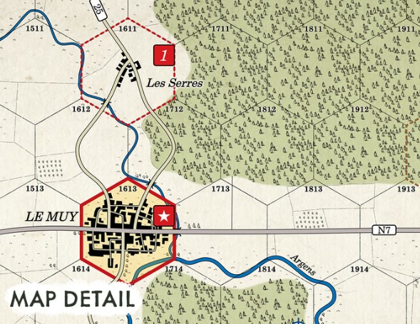 Dan: The game board is a hex map of the Argens and Naturby River valleys and surrounding areas in in the Var Department, Provence-Alpes-Côte d’Azur Region, of Southern France. The area shown is about 12 miles (20 kilometers) north-northwest of the Riviera coastline and the DRAGOON landing beaches. It includes an area of about 10×12 kilometers centered on the three Allied drop zones. It includes the towns of Le Muy, La Motte, Les Arcs, Trans-en-Provence and Draguignan.