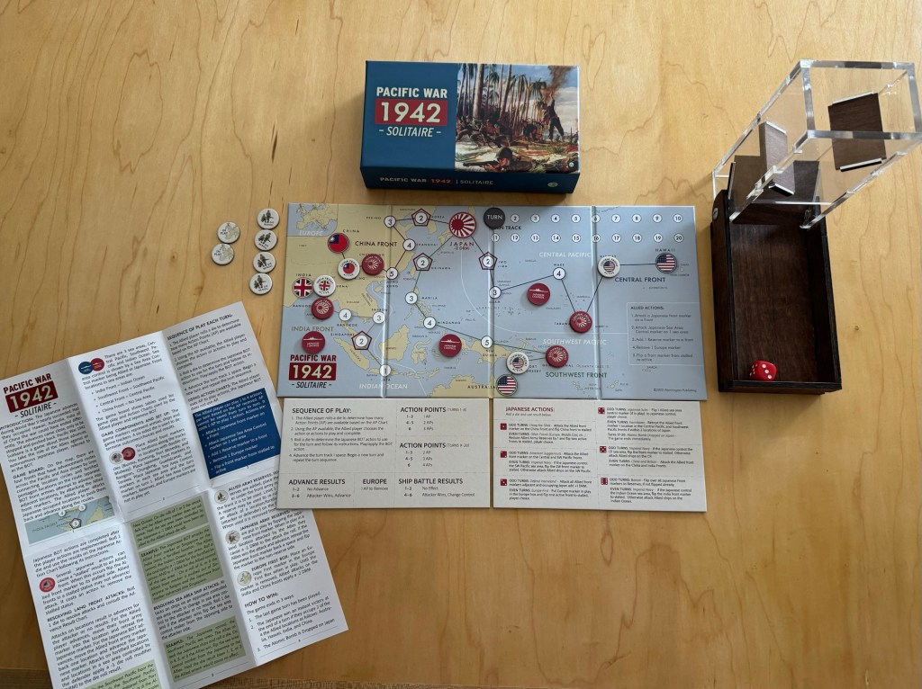 I want to immediately provide you an idea of what this game is and what it is not. I think that sometimes people buy a game like this and expect a really deep and involved simulation of the events of World War II in the Pacific with no real basis for that belief other than their hope or preconceived notions. I want to let you know that I really do enjoy this game. I have played it a lot of keep coming back to it. That says something about it right there. But a game that sets up in 30 seconds, plays in 20 minutes or less and gives you some choices and is solo is a pretty good deal in my opinion. The game is very simple and borrows its structure from the well liked States of Siege Series of solitaire wargames made famous by Victory Point Games starting with Darin Leviloff’s Israeli Independence: The First Arab-Israeli War published in 2008 and which now has over 40 volumes. The game uses the concept of several tracks representing the various theaters of the Pacific War including the Central Front (Hawaii through the island hopping campaign of the Central Pacific), Southwest Front (Australia through Guadalcanal and the Philippines), India Front (Burma through to Singapore) and the China Front (Kunmino to Korea) that all converge on Japan and its holdings. The main difference here though is that the player is the one who must make progress down the various tracks and are not the one defending against those advances. The progress on these fronts comes by attacking the defending Japanese units pushing them back one space at a time with the ultimate goal being to occupy Japan itself, which is a tall order. The game is very high level, strategic, and lots of elements are abstracted down to a single die roll to attack and then at the end of each Turn a die roll for the Japanese Bot to determine their actions.