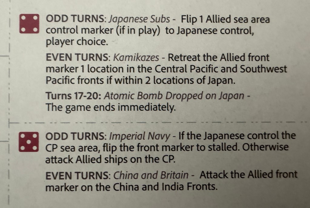 I mentioned that I have played War of 1812 Solitaire a lot as well, and that game is also very good, but it doesn’t use this type of connection to the operations on the lakes and the resulting ground campaigns and I think that that game is worse for it. Still good but I don’t really like it as much. There is also a connection to some of the Japanese Bot actions that focus on the control of these Sea Areas. When certain numbers are rolled, namely 2, 4 and 5, if the Allies don’t control the Sea Area referenced then they will have to Stall that Front by turning its marker over to its stalled side. This means that this Front is inactive and cannot attack until the player spends one of their precious Actions to reactivate and flip that marker back over to its Active side. Also if the Allies do control the Sea Area it will then be attacked by the Japanese which will require a roll of a 4-6 on a d6 to be successful. Once again, a perfect real world connection between the amphibious nature of the War in the Pacific. If you can’t get supplies through, including ammunition, fuel and food for the troops, then that Front becomes ineffective until you reestablish control over the Sea Area.