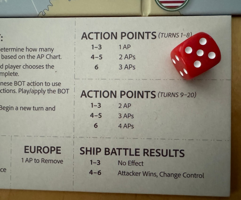 There are two different sets of Action Point determinations though as there is one chart that is used during the first 8 Turns of the game and then a second more liberal chart that is used from Turn 9-20. I want to point out that this too is a very good historical abstraction of the concept of industrial capacity and the manufacturing might of the United States. After Pearl Harbor and the Americans being caught flat footed, it took some time to mobilize the industrial capabilities in the States and develop the workforce to switch from making baby bottles to making bullets, bombs, tanks and rifles. This is shown by Action Points being harder to come by in the first 8 Turns, which represent December 1941 to approximately August 1942, and easier to achieve from Turn 9 to the end of the game. During the first 8 Turns you will get 1-2 Action Points. That’s really it. Occasionally you will get lucky and roll a 6 earning 3AP’s. But you will have to learn your do without and to simply stay alive and keep the Japanese at bay.