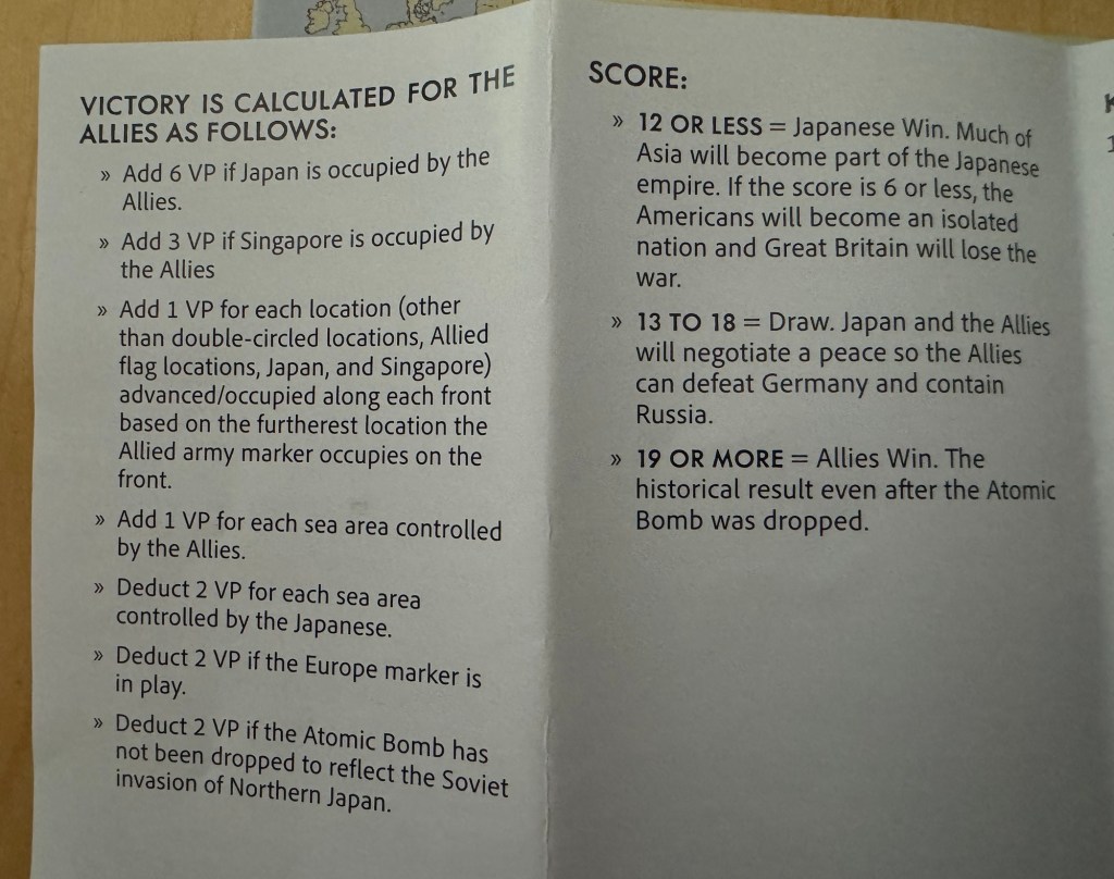 Scoring is a very unique part of the game and you will start out in a negative position. At the outset you are at -8VP. This is calculated by simply following the scoring calculations found on the back page of the rules book. -6 because the Japanese control all 3 Sea Areas (-2 fir each) and then an additional -2 because the Atomic Bomb hadn’t been dropped. So you can see you start in a large hole. You will gain points for each step of progress your armies make on each of the 4 Fronts, 1VP per space you control, 1VP for each of the Sea Zones controlled by the Allies (and this is a huge swing as you go from -2 for Japanese control to +1VP), +6VP if you occupy Japan and another +e if you occupy Singapore. In a perfect game, the max score possible would be 30VP but don’t count on it. Also your VP total will be compared to various thresholds and your level of victory or defeat will be known.