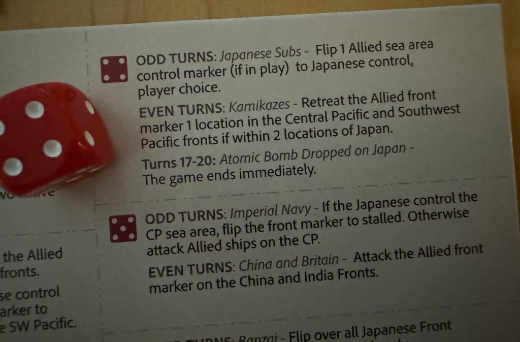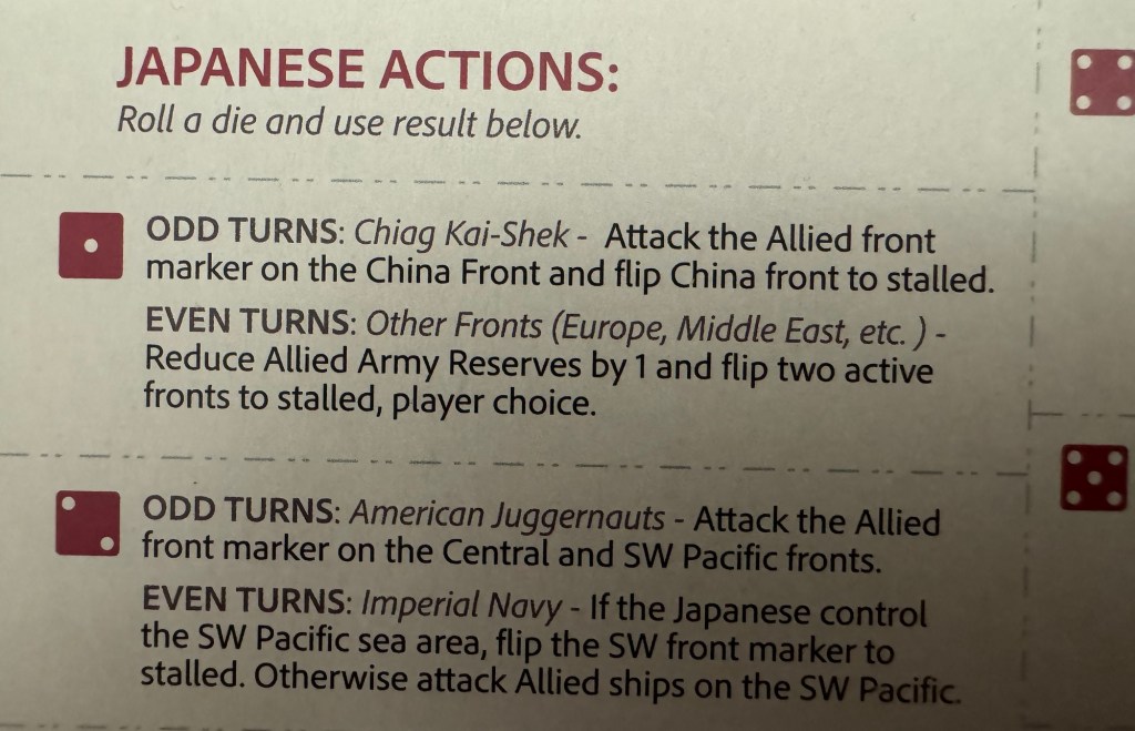 The most vague part of the rules has to do with the result for the Japanese Bot when they roll a 1 on an Even Turn. With this result it states “Reduce Allied Army Reserves by 1 and flip two active fronts to stalled”. Seems simple but what if you don’t have any Reserves on the board? Does this mean remove 1 from the supply and you will not have access to it? Maybe. I think that if you have any on the board you should remove one but I just don’t know. It’s not clear. There are 4 such Allied Army Reserves but I really don’t find them that useful (see next section).