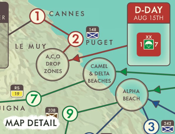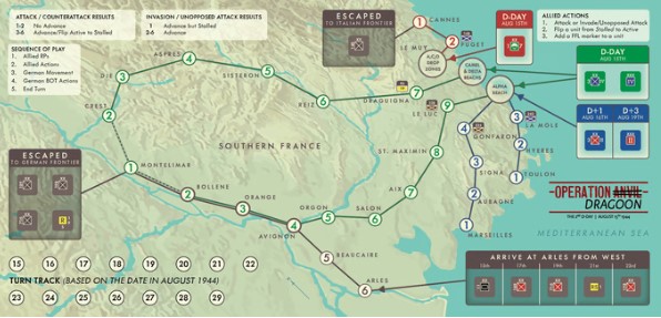 Dan: 2 landing beach areas and one drop zone are the starting locations for the Allied forces. There are over 25 objective cities/towns, including the two fortress ports of Marseilles and Toulon. The main axes of advance for the five major Allied units are portrayed by color-coded lines. There is one withdrawal route for the Germans indicated on the map as well. There are also boxes for German units that escape destruction, a turn track and tables.