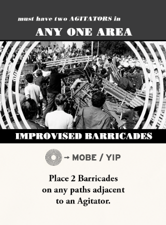 This initial barricade placement allows the demonstrators to get a head start on breaching the downtown city areas before the Police break through. Unless this card comes into play, no additional barricades may be placed.