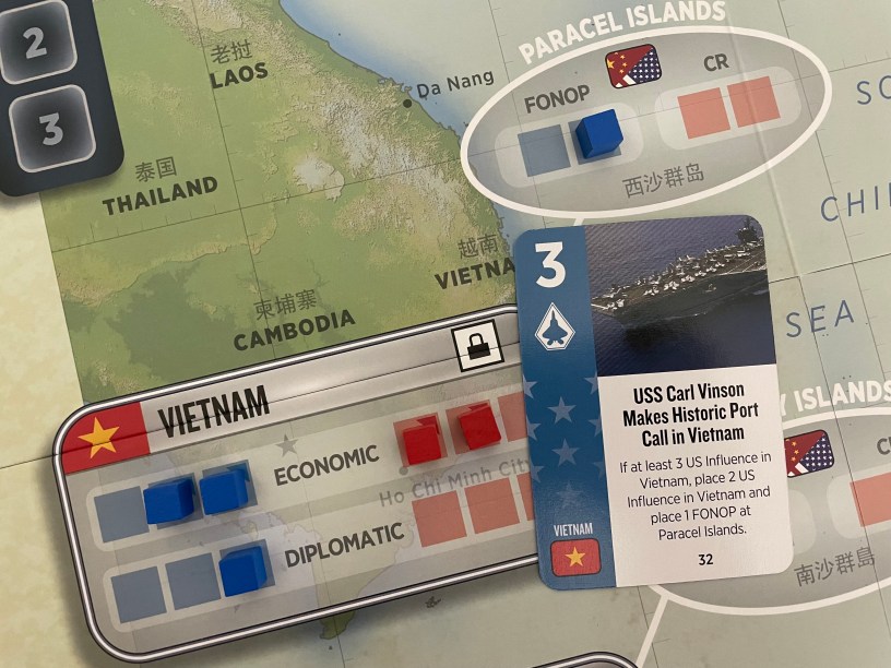 One of my most favorite aspects about the Card Driven Game genre is that of managing the negative effects or capitalizing on the effects of a card by paying attention to the current board state and whether or not various pre-requisites for a card’s event are met in order to go off. This can be a real source of tension as you look at a card and realize either it can or won’t hurt you now but if you wait it might become suited for it to be able to be executed. The USS Carl Vinson Makes Historic Port Call in Vietnam is a good example of such an Event that has a prerequisite to play. The card also provides the player with the opportunity to place both Influence Cubes and a FONOP (Freedom of Navigation Operation) on one of the disputed islands in the South China Sea. This is a very powerful dual effect that players must be ready to take advantage of.