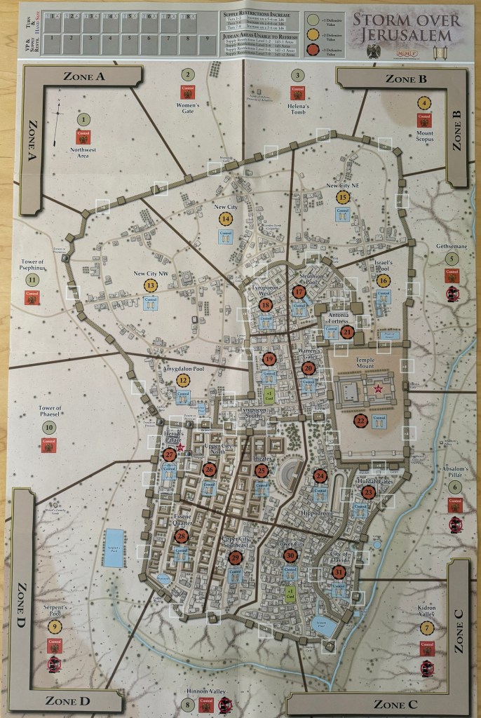 Storm Over Jerusalem: The Roman Siege is a 2-player wargame that simulates the Roman siege of Jerusalem during 70 AD. One player controls the mighty Roman forces, who are truly master of siege warfare with their siege towers, ballista, battering rams and onagers, and the other player controls the Judean forces, which are divided into 2 separate factions with different leaders. The game is 8 turns long, but can be shortened by the play of a few event cards, at the end of which time the winner is determined by calculating victory points that come from overall losses, holding of certain VP areas and keeping the Romans out of the city.