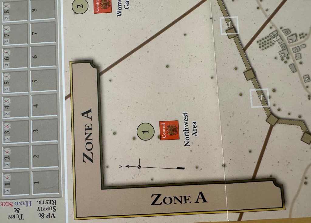 One final element that I want to take a look at in this piece is the various Zones located on the outside of the city itself. These include Zone A (located in the upper right hand corner), Zone B (located in the upper left hand corner), Zone C located in the bottom right hand corner) and Zone D (located in the bottom left hand corner). These areas are where the Roman player may place their oncoming troops and units. From these areas, they will then activate the units in the areas to attack and move against the walls defending the city. I really like the way the Zone Title graphics are laid out as they are clear, stand out from the background of the terrain, although it is just a darker shade of brown than the sandy desert, and that they are in a large substantial type face.