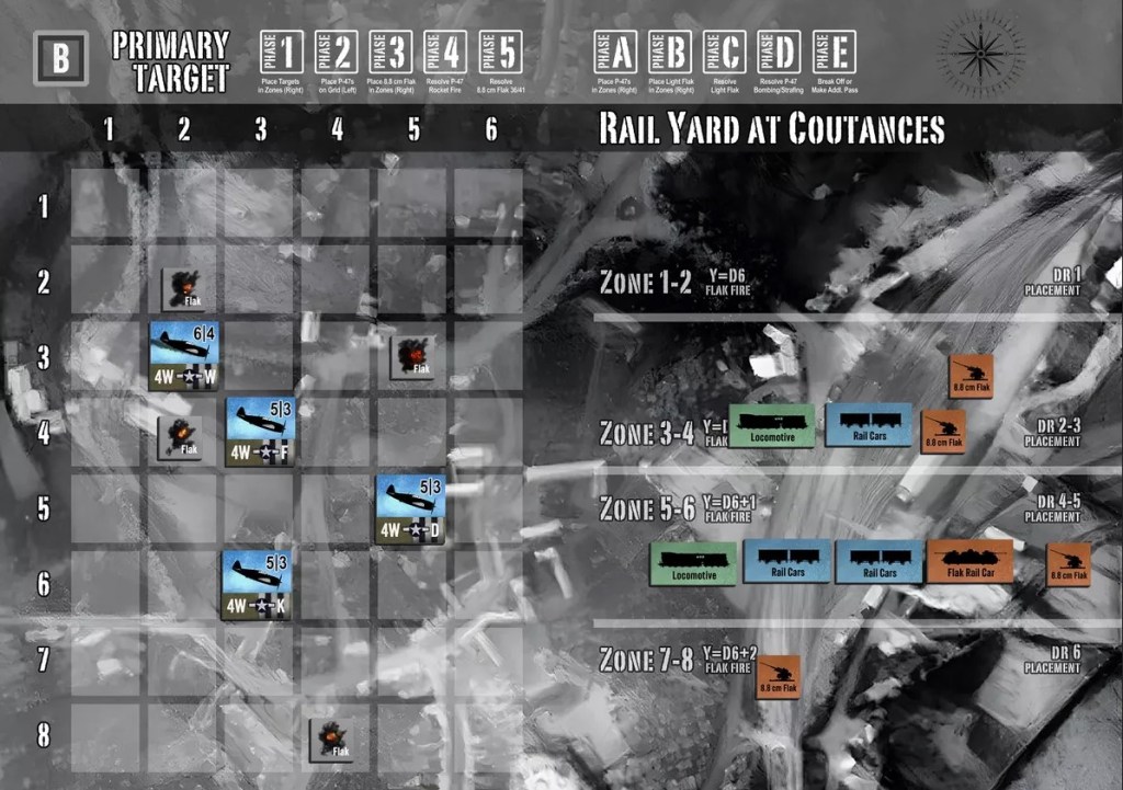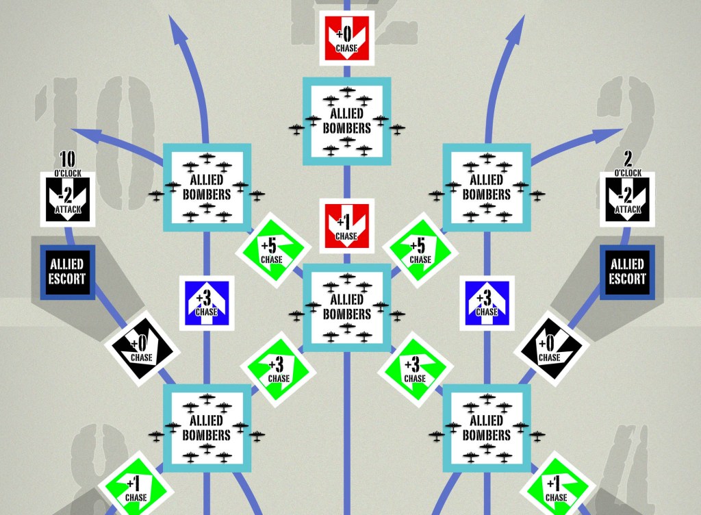 The game mechanic for heavy flak in Achtung Jabo! works like this – you roll dice to place individual heavy flak bursts (German 88’s) on a grid, the dice giving you the X and Y axis positions. Thus, the flak bursts explode around your planes. Their proximity determines what potential damage is done, whether the pilot is wounded, and how badly, and so forth. It is very visual and gives you the impression of being there. I’m already working on a game that implements that for medium bombers. Your formation fly through the flak barrages. The flak bursts randomly appear around your planes.