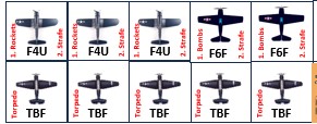 Greg: The fighters actually bomb and fire rockets, depending on the type, but all of them strafe. The Japanese player will find many of his gun crews wiped out accordingly (these are the 25mm triple mount crews, which were exposed on the deck with only a small gun shield at best for protection.) The dive bombers drop armor piercing bombs, of course, and the torpedo bombers launch torpedoes.
