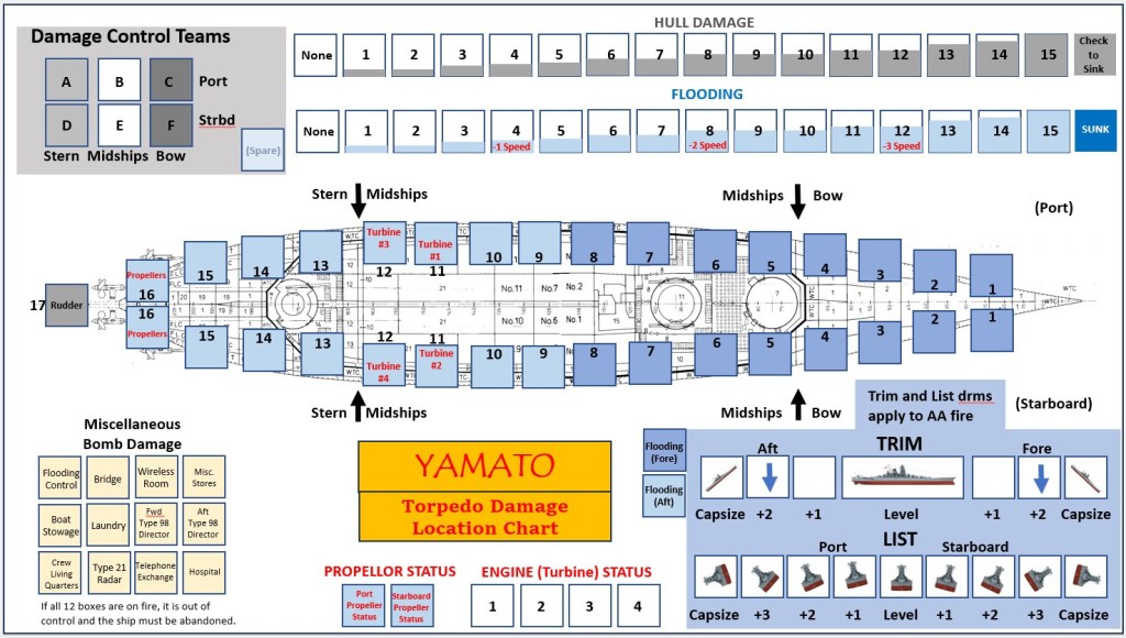 Greg: The board has a top down view of Yamato, with the guns up top and a second view of the below decks (to show the location of torpedo hits and flooding).