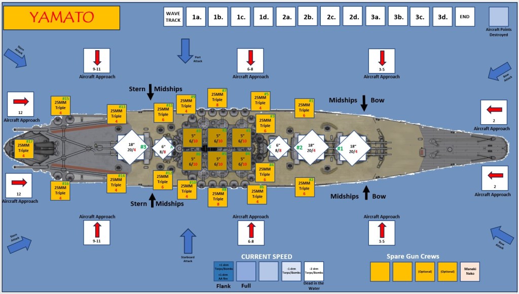 Greg: You roll for wave arrival. Assuming your radar hasn’t been knocked out, you know in advance if that’s port or starboard so you can train your big batteries in that direction. The attacking planes in each wave arrive randomly (bow, stern, or midships) and you have to allocate your AA fire. Then, any surviving aircraft attack. You then allocate your damage control teams, possibly replace eliminated gun crews, put out fires, and counterflood if needed (to keep the ship from capsizing).